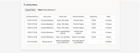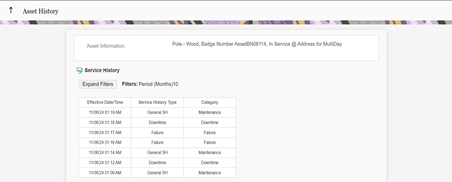 1. On the Asset/Equipment Details page, click Asset History in the Quick Links section. The Asset History Details page, you can see the Service History, Measurements, and Activity History details.