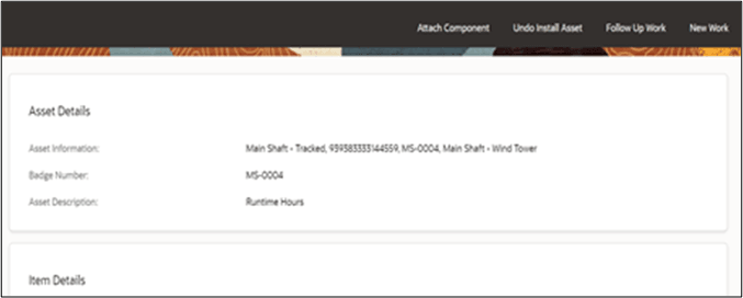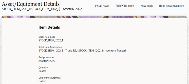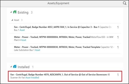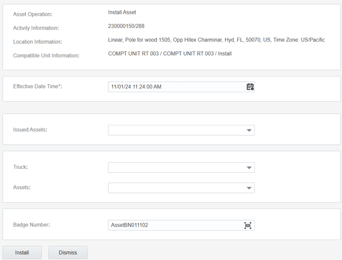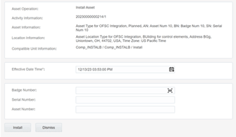 Badge Number field. The real-time asset verification call is sent to Oracle Utilities Work and Asset Cloud Service. After successful response, asset type of the asset will be validated to match the asset type of the compatible unit. Then, the asset will be moved to Install pool in Oracle Field Service.
