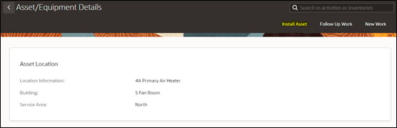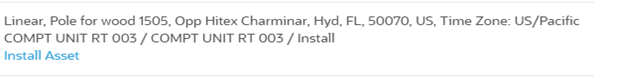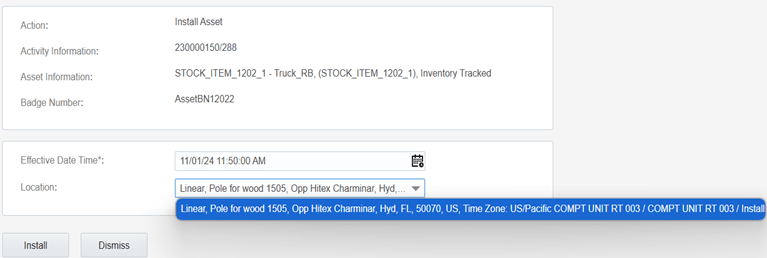 The field worker can install the issued asset on the location. The location type and asset type should be same. Else, the assets will not be shown in the