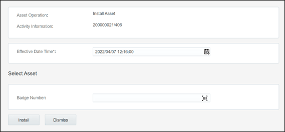 4. Enter the Badge Number of the asset to be installed in this location and click Install.