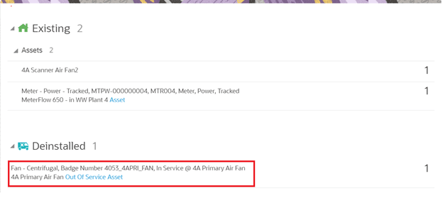 The asset moves to ‘out of service’ status in the Deinstalled pool.