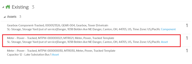 Assets/Equipment page in Oracle Field Service. Click