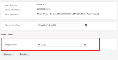 3. Enter the badge number of the asset to be replaced with and click