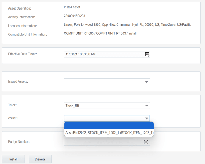 The field worker can install a truck asset on the location. The compatible unit asset type and asset type should be same. Else, the assets will not be shown in the