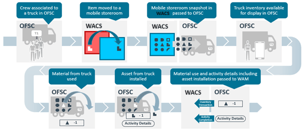 Mobile storerooms (trucks) and their inventories are managed in Oracle Utilities Work and Asset Cloud Service. A truck in Oracle Field Service is linked to a Oracle Utilities Work and Asset Cloud Service mobile storeroom.