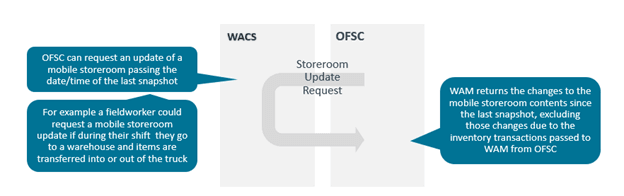 On request, the contents of the Oracle Utilities Work and Asset Cloud Service mobile storeroom is passed to Oracle Field Service and the contents of the linked Oracle Field Service truck is updated.