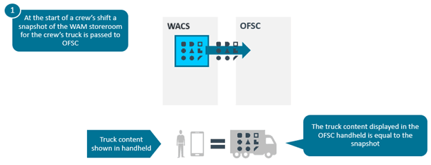 This process passes the inventory of truck storerooms from Oracle Utilities Work and Asset Cloud Service to Oracle Field Service updating the inventory of the Oracle Field Service truck that is linked to the Oracle Utilities Work and Asset Cloud Service storeroom.