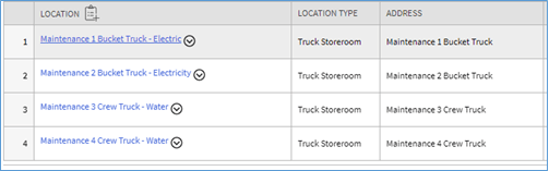 The following figure shows the truck storerooms in Oracle Utilities Work and Asset Cloud Service: