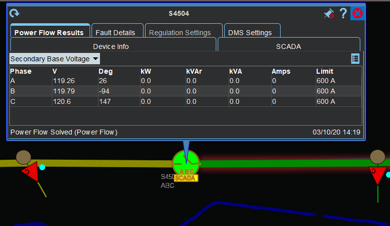 As an object is selected in the Viewer, the Power Flow Results tab updates with the calculated feeder voltages and equipment flows. The lower right corner of the Power Flow Results tab will display the time when the last solution was solved.
