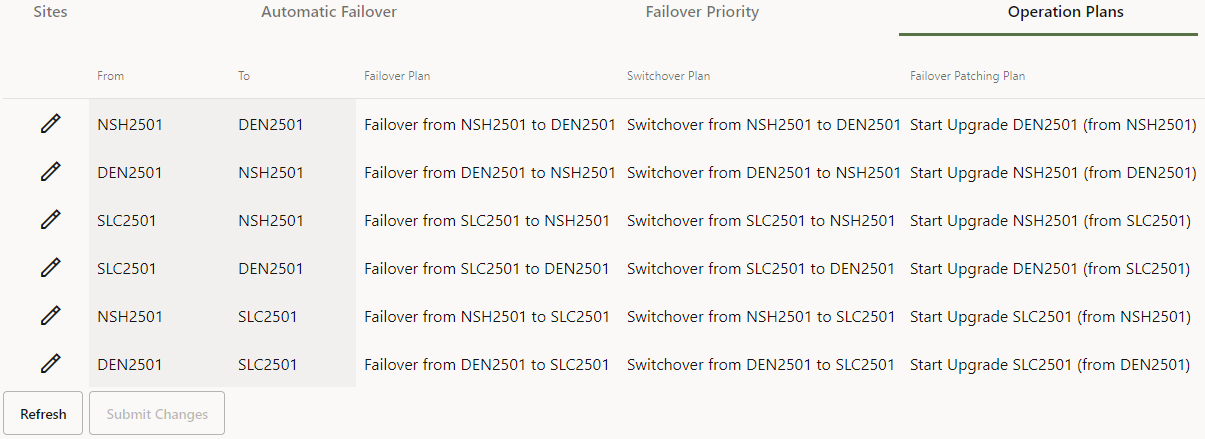 The Operation Plans tab allows you to select the operation plans to be used for the various types of operations between each pair of NMS sites. These plans must be configured before manual switchover or failover or automatic failover will work.