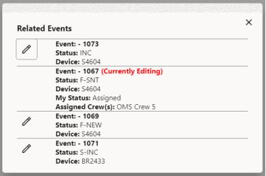 The related events panel will list details about events that are related to the event being edited. Use the edit icon () to switch the editing event.