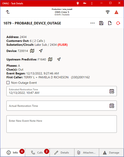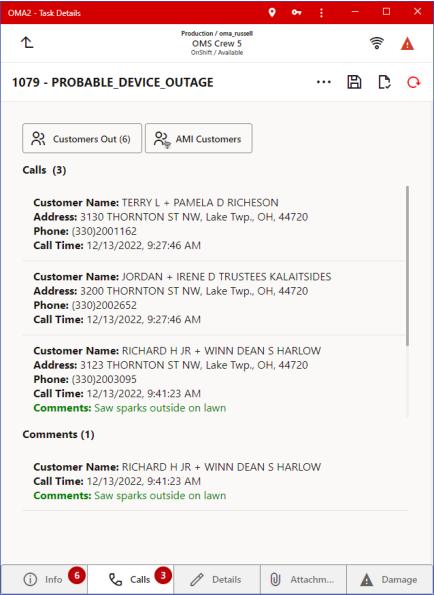 The Calls tab lists calls for the outage or non-outage event. This contains the following options for the selected row.