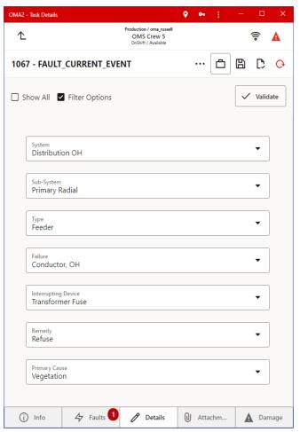 The Details tab allows you to enter completion details for the event and, optionally, complete the event. When you tap the Complete icon (), the system will verify that you have all of the completion requirements satisfied before submitting to the server; if you are missing required data, the Details page will highlight any fields that are missing data.