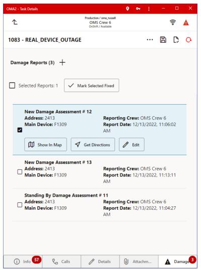 • Show in Map () switches to Map tab and focuses map on the damage assessment location.