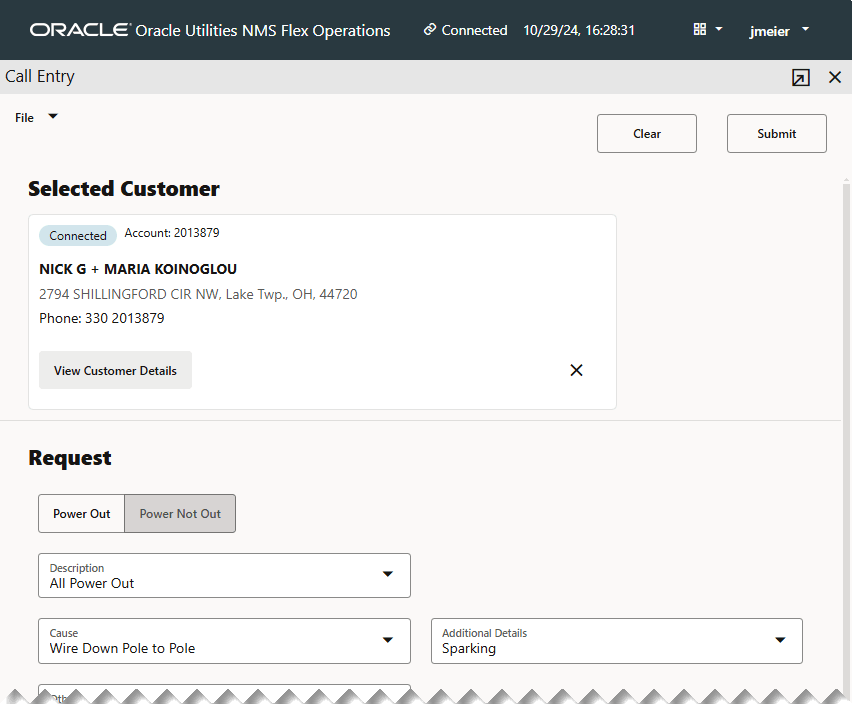 The Request section contains drop‑down lists that allow you to enter clues and other data about the event. The selections available are configured to meet your company's criteria; for example, whether individual service is completely or partially or if the area is out.