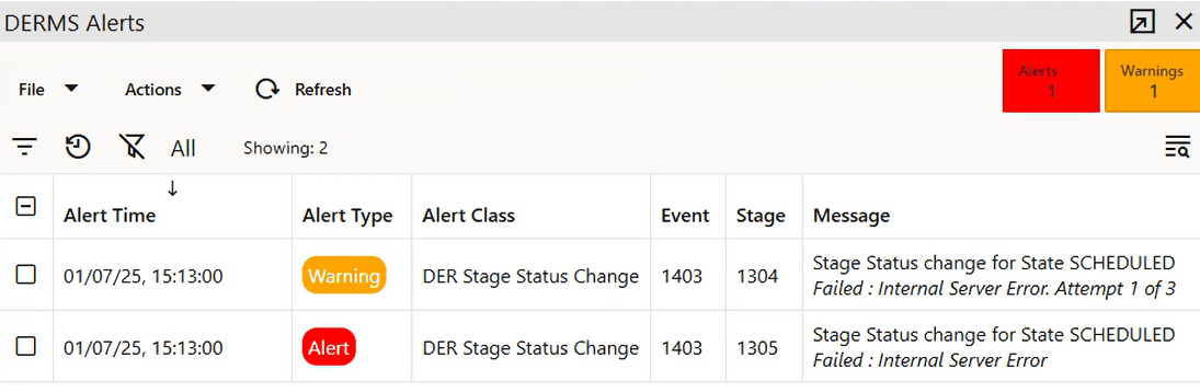 Operators can pre-empt the system retry by selecting the alert and choosing the Retry action. Once the maximum number of attempts is reached, the system will stop attempting to resend the message. At that point, if the alert is still active in the DERMS Alerts tool, the operator may select the alert in its final state and request that the message be resent, which will start a new cycle of retry attempts.