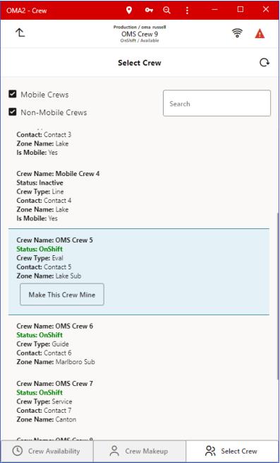 The Select Crew tab is available to users with permission to change their associated crew. To associate yourself with a crew, select the crew card and then hit the check mark. Your associated crew will then appear on the top of the main menu bar.