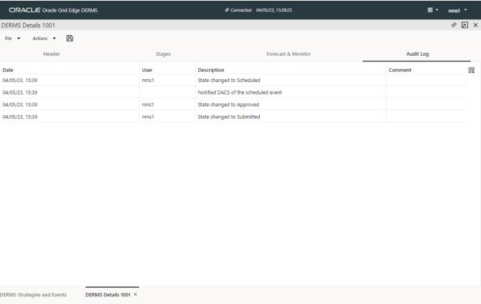 The Audit Log tab displays audit log details about the strategy or event, including state changes, notifications to external systems, and stage edits.
