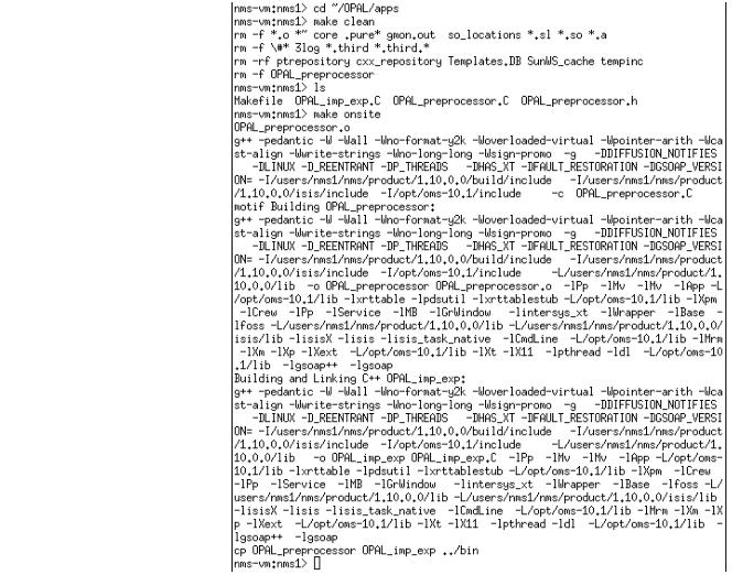 From the command prompt within the $NMS_CONFIG/apps directory, build the custom program with "make clean" to remove old compiled binaries and "make" to compile and install the binaries into the $NMS_CONFIG/bin directory.