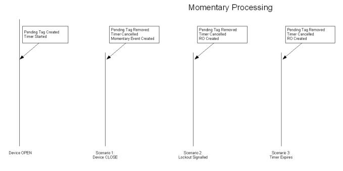 These figures show the sequence of events in a Fault Location, Isolation, and Service Restoration scenario. The following figure shows the various scenarios in the momentary processing.