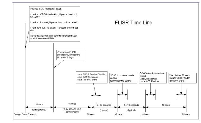 Timings in the above diagram are only indicative. Actual values will depend on the complexity of the solution required and the responsiveness of the isolate/restore controls sent to SCADA. The following timings are deterministic: