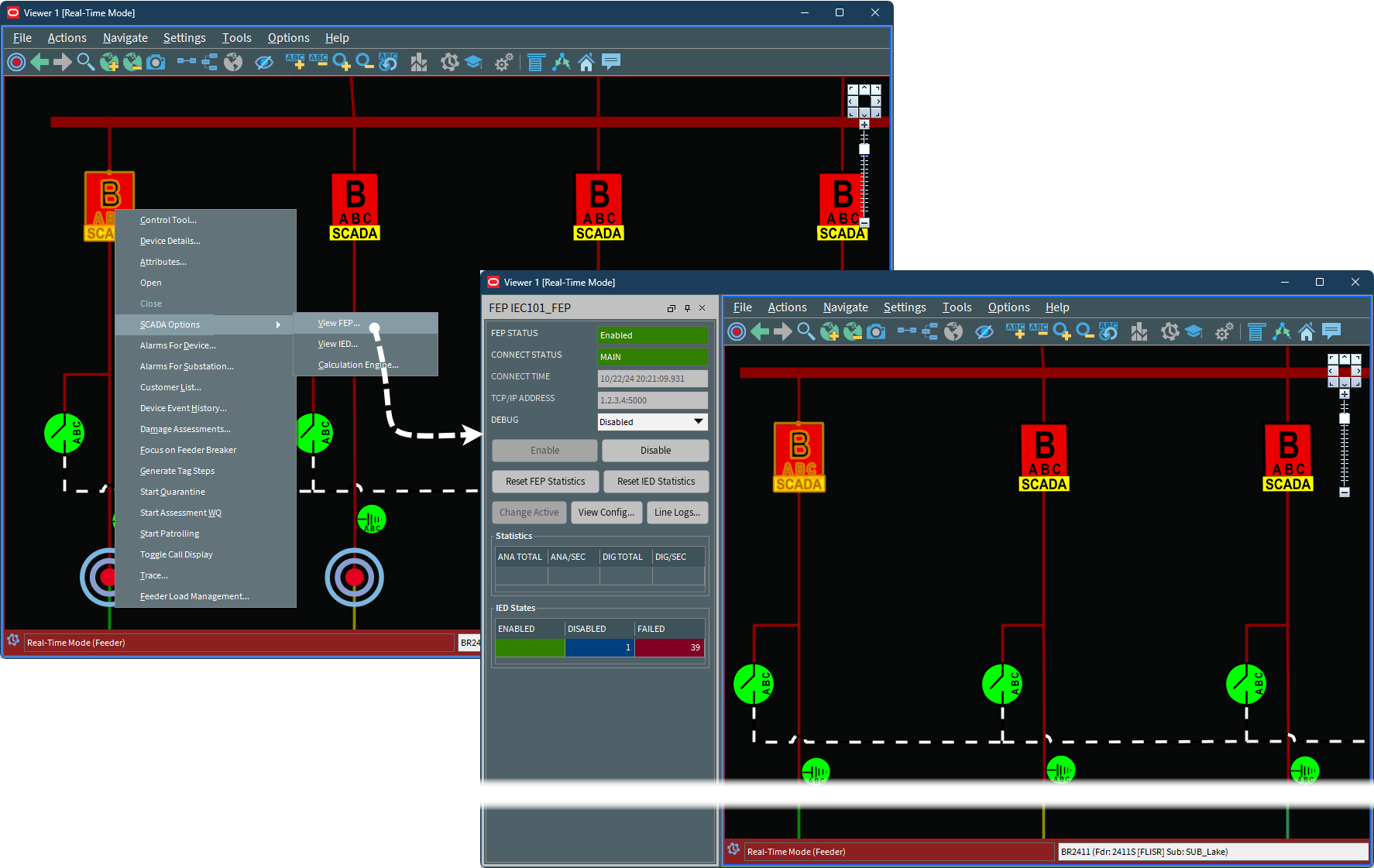Users that do not have the SCADA maintenance privilege may still want to view and control the FEP state. This can be done by selecting a device having valid Flex SCADA connections in the Viewer, and then selecting the View FEP... option from the SCADA Options context menu.