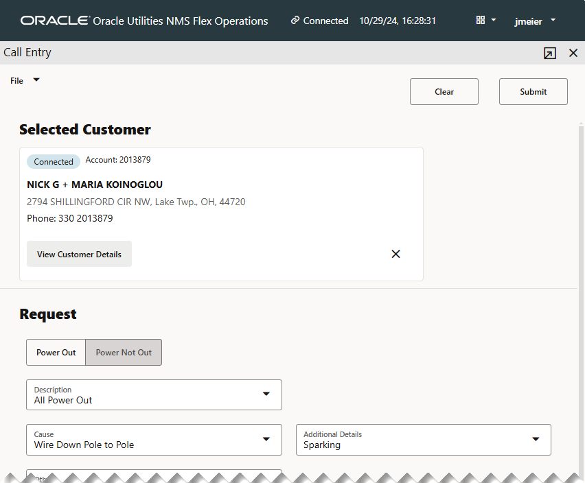 The Request section contains drop‑down lists that allow you to enter clues and other data about the event. The selections available are configured to meet your company's criteria; for example, whether individual service is completely or partially or if the area is out.