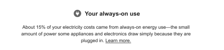 The amount is calculated using the Always-on Disaggregation Model, which estimates the electricity consumption associated with appliances and electronics that consistently draw power even when they are off or in sleep mode, such as set-top boxes, gaming consoles, security systems, and digital assistants. It also estimates consumption for appliances which are always running, such as refrigerators.