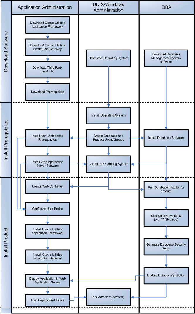 The following diagram provides an overview of the steps that need to be taken to install and configure Oracle Utilities Smart Grid Gateway: