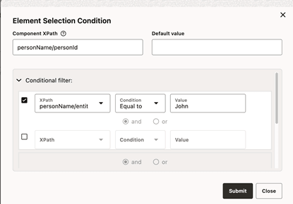 c. On the Element Selection Condition screen, click Submit, and then click Close.