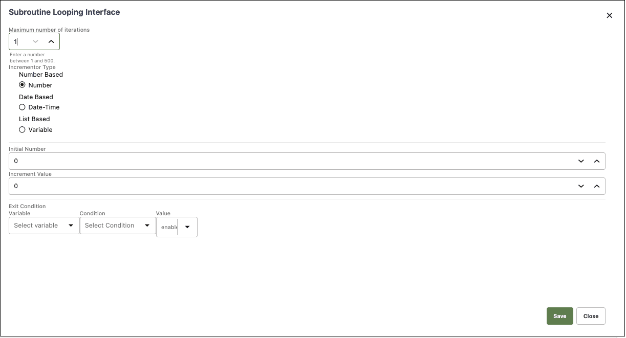 • Variable: Can be either based on a value of the incrementor variable or any OUT variable of the subroutine. An OUT variable of a subroutine can be used if the subroutine loop should be terminated after a particular value is available in the selected variable.