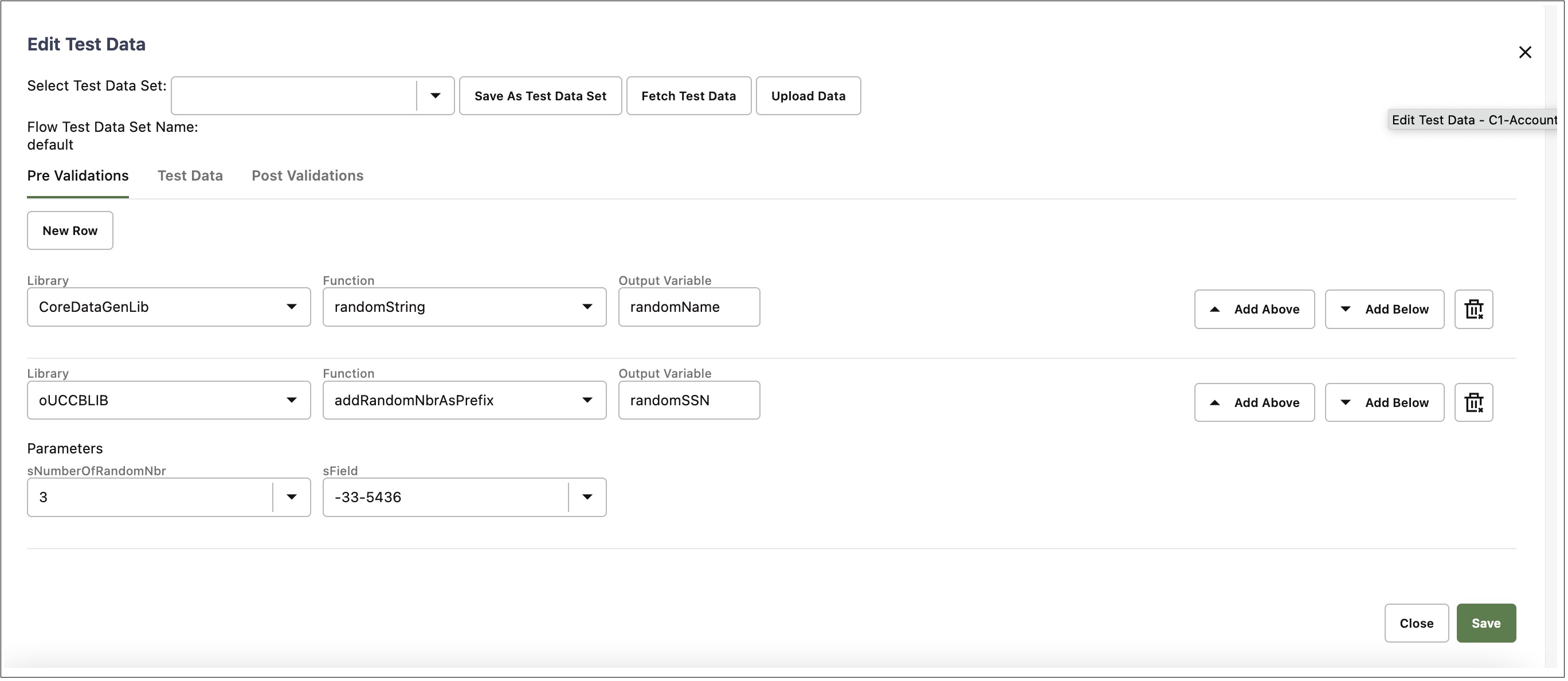 The Pre Validations section can be used for specifying functions that can generate randomized test data for the flow/component step. It is used to add functions in the components that may be specific to the flow being developed. Click New Row to add new rows.