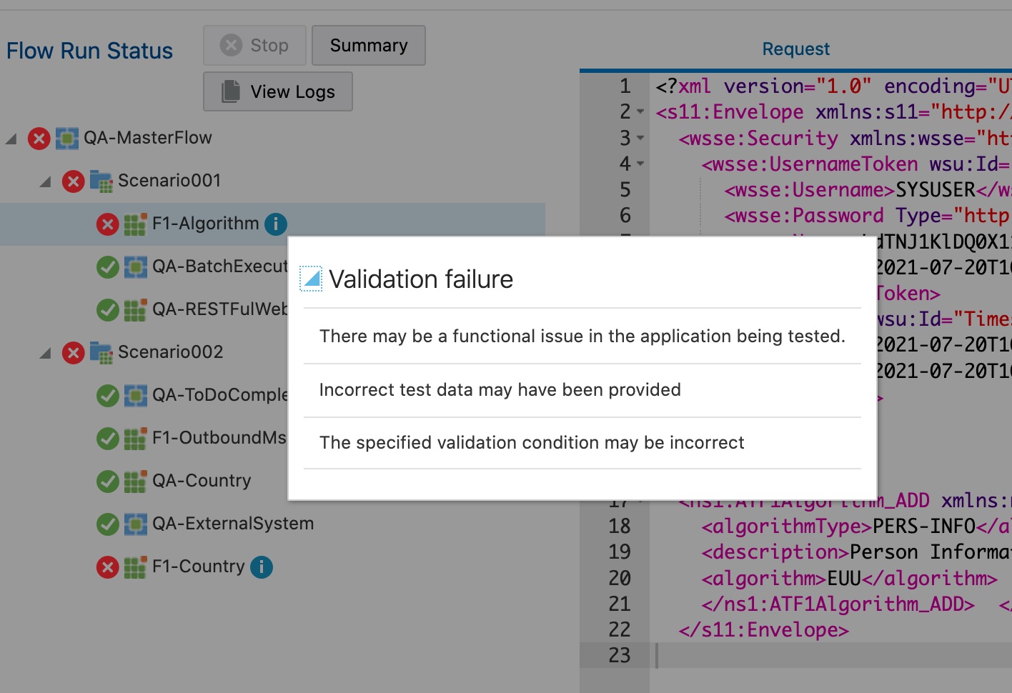 The request-response details are displayed as lable-value pairs, similar to the flow test data GUI, where in the label is the element name and the value is the data that was set in the request or received in the response, for that element.