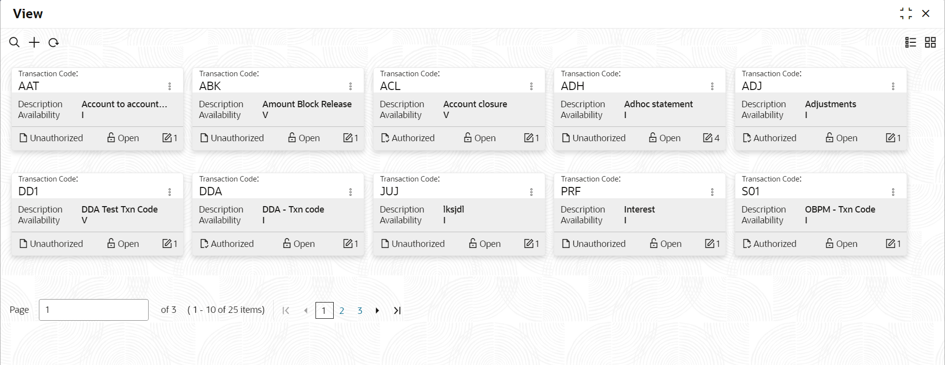 Field Description Transaction Code Displays the Transaction Code. Description Displays the description of the transaction code. Availability Information Displays the value A, V or I. Authorization Status Displays the authorization status of the record. - Authorized