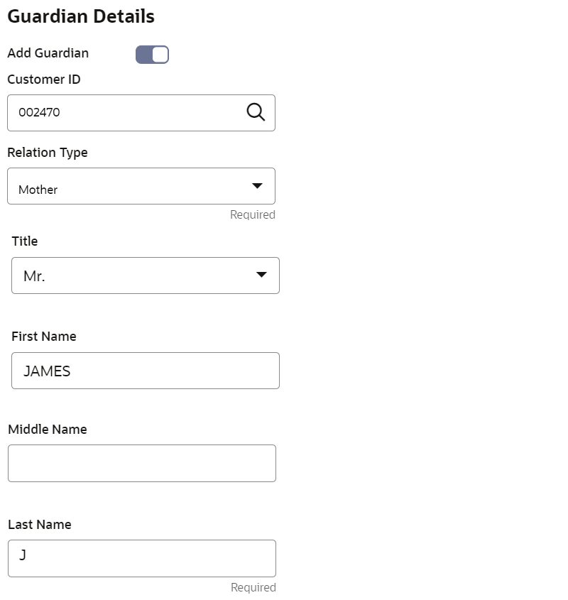 Customer ID Select or specify the customer ID to default the guardian details from selected customer. Relationship Type Select the relationship type with the guardian. Title Select a title for the guardian. First Name Specify the guardian's first name. Middle Name Specify the guardian's middle name. Last Name Specify the guardian's last name. Address Details This section displays the fields to capture the guardian's address details. Default Address Select the default address for the guardian. The options are: - Nominee: If you select this option, then the guardian address is defaulted from nominee address.