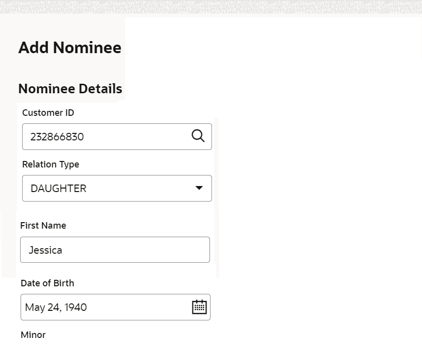 Field Description Nominee Details This section displays the fields for capturing the basic nominee details. Customer ID Select or specify the customer ID to default the nominee details for the selected customer. Relationship Type Select the relationship type with the nominee. First Name Specify the nominee's first name. Date of Birth Select or specify the nominee's date of birth. Minor Displays whether the added nominee is a minor or major based on the date of birth selected or specified. Note: