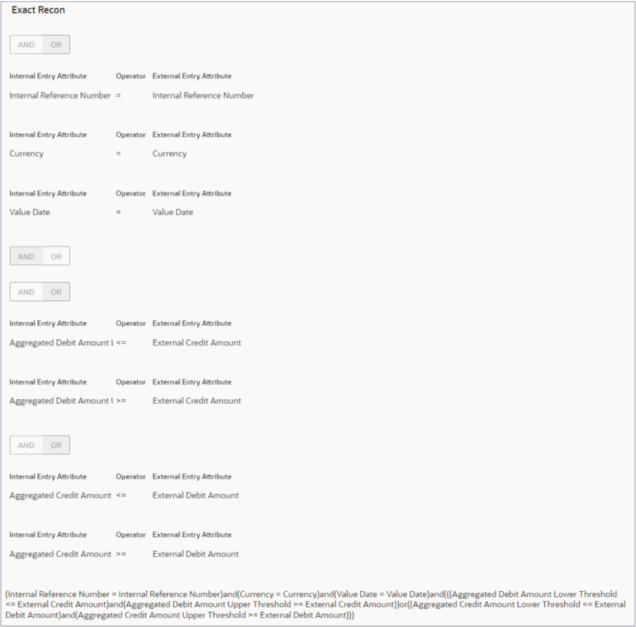 To view the list of all internal and external attributes and their descriptions, see Internal and External Entry Attributes.You can create any number of reconciliation rules according to your requirements using these internal and external transaction entry parameters.