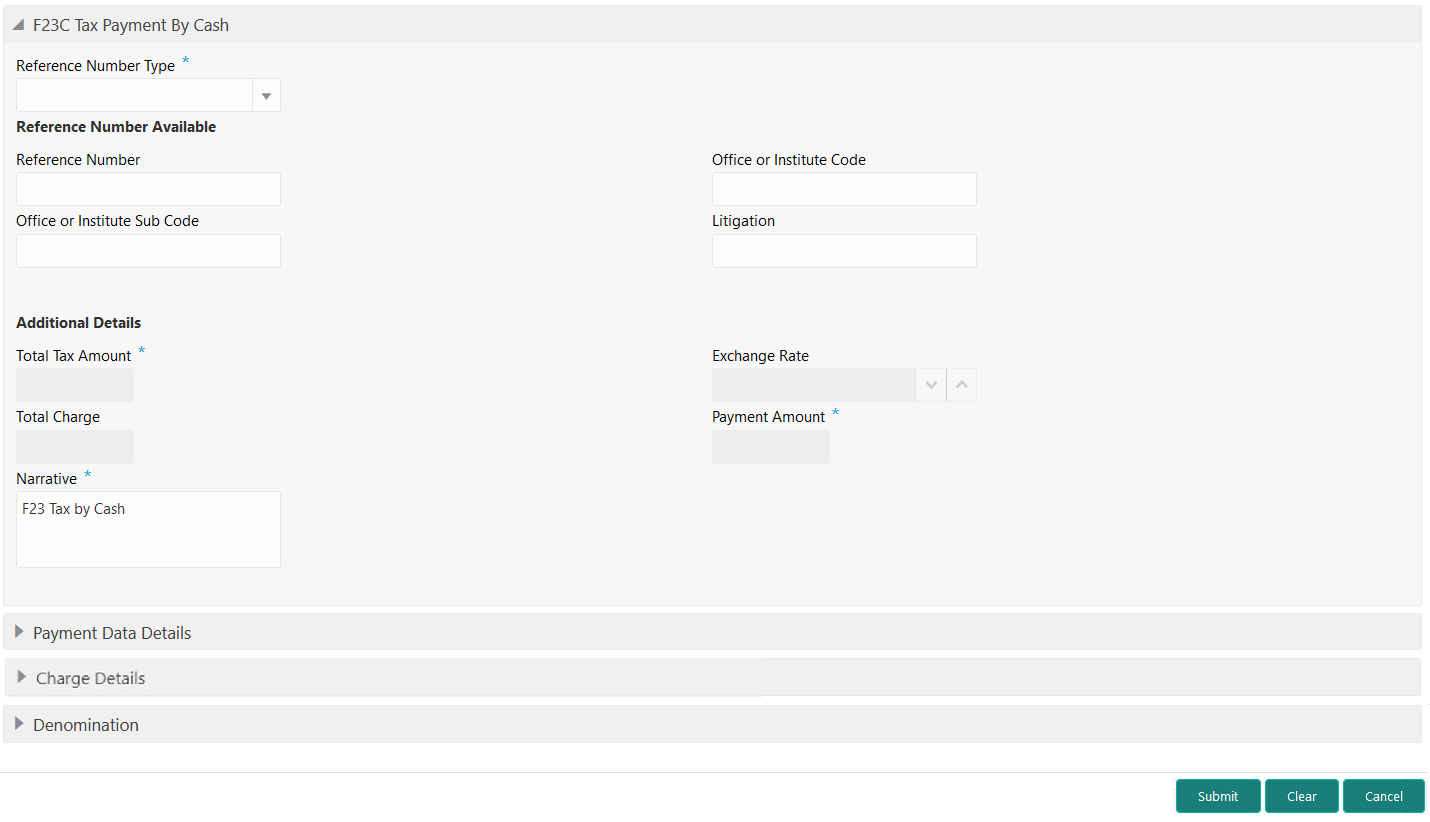 The F23C Tax Payment By Cash screen is used to capture data related to the F23C tax document for a customer and collect the corresponding tax by cash from the customer.