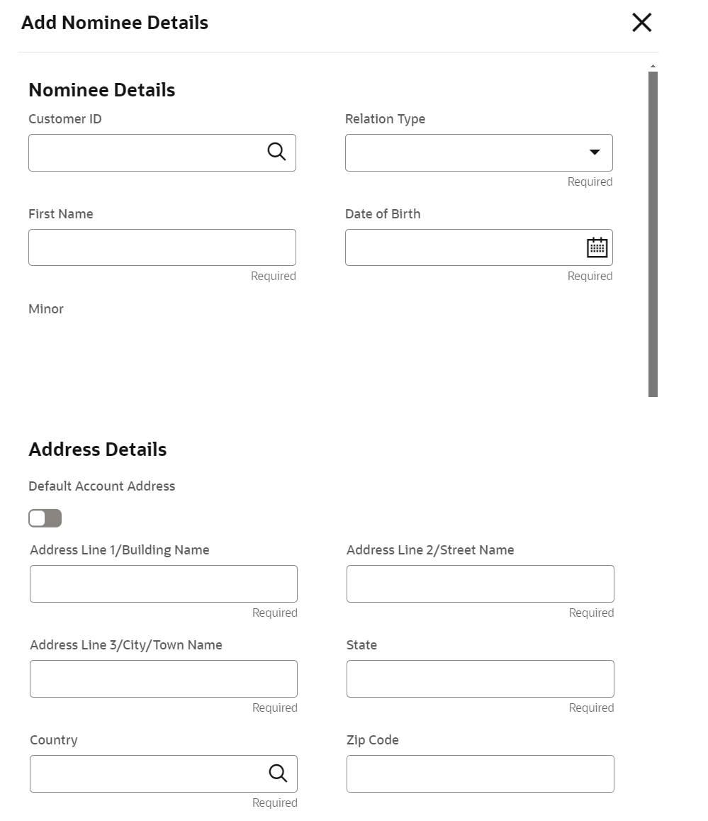 Field Description Nominee Details This section displays the fields for capturing the basic nominee details. Customer ID Select or specify the customer ID to default the nominee details for the selected customer. Relationship Type Select the relationship type with the nominee. First Name Specify the nominee's first name. Date of Birth Select or specify the nominee's date of birth. Minor Displays whether the added nominee is a minor or major based on the date of birth selected or specified. Address Details This section displays the fields to capture the nominee's address. Default Account Address Switch to