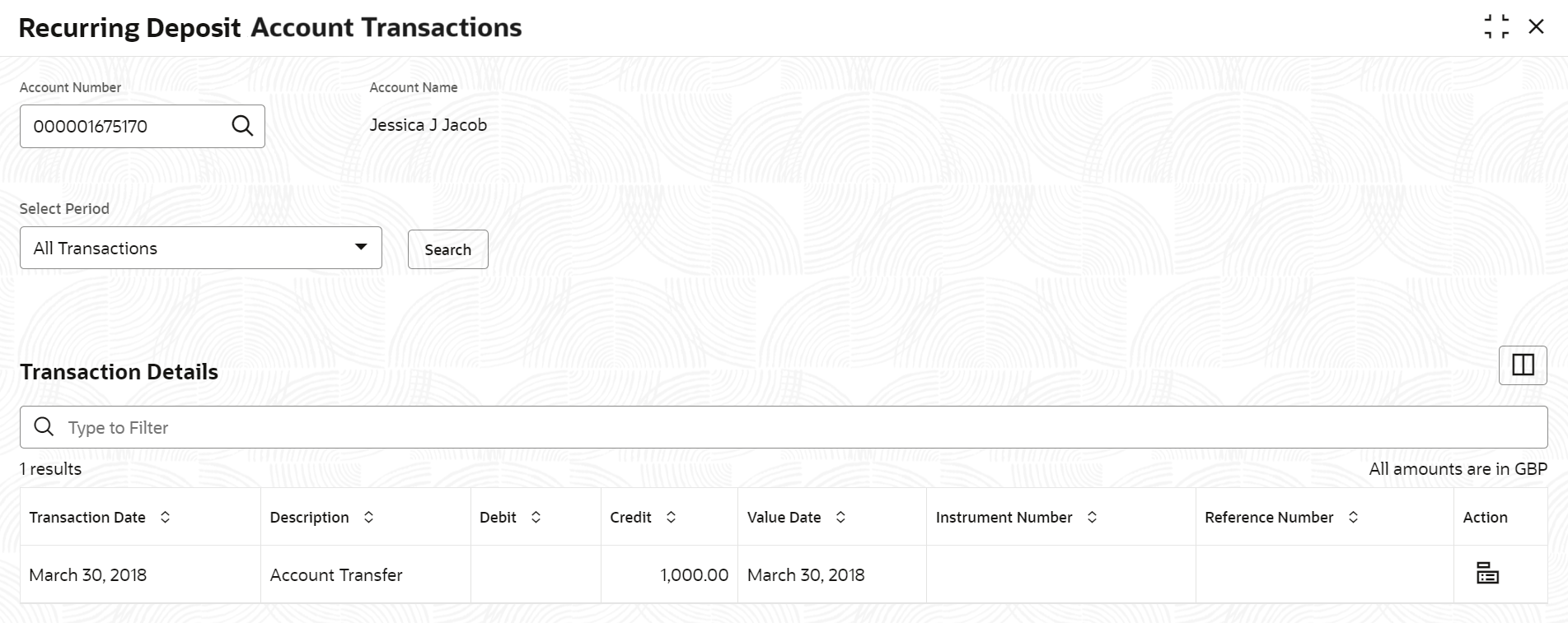 Description of "Figure 9-2 Recurring Deposit Account Transactions Details"For more information on fields, refer to the field description table.Table 9-1 Recurring Deposit Account Transactions – Field Description