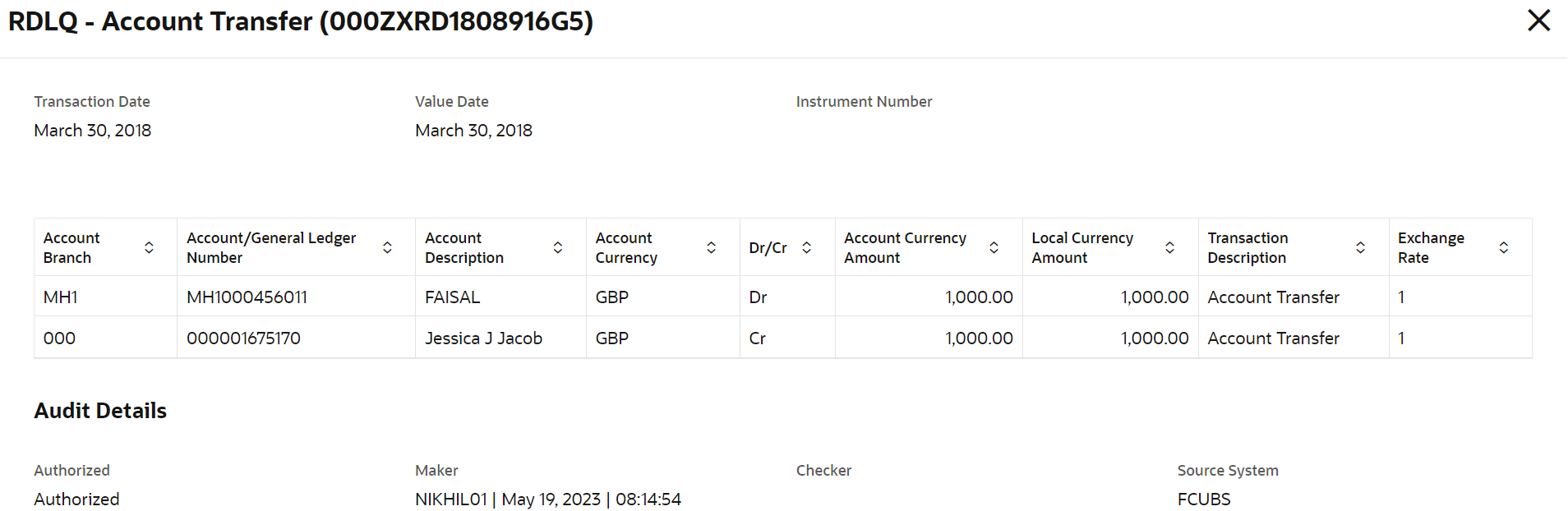 Audit Details Displays the audit details such as authorization status, maker, checker, and source system.