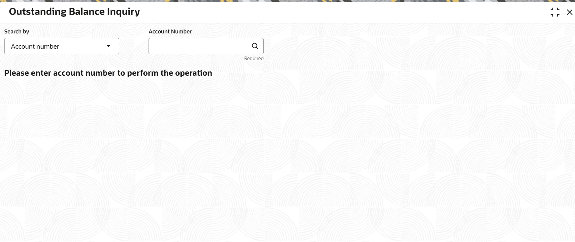 The label of the field adjacent to the Search by field changes dynamically. For example, if the Account number is chosen as the search criteria, the label of the adjacent field is displayed as the Account Number. If SSN is chosen as the search criteria, then the adjacent field would display the label as SSN.Total Outstanding Displays the different parameters used to calculate the total outstanding balance. Note: