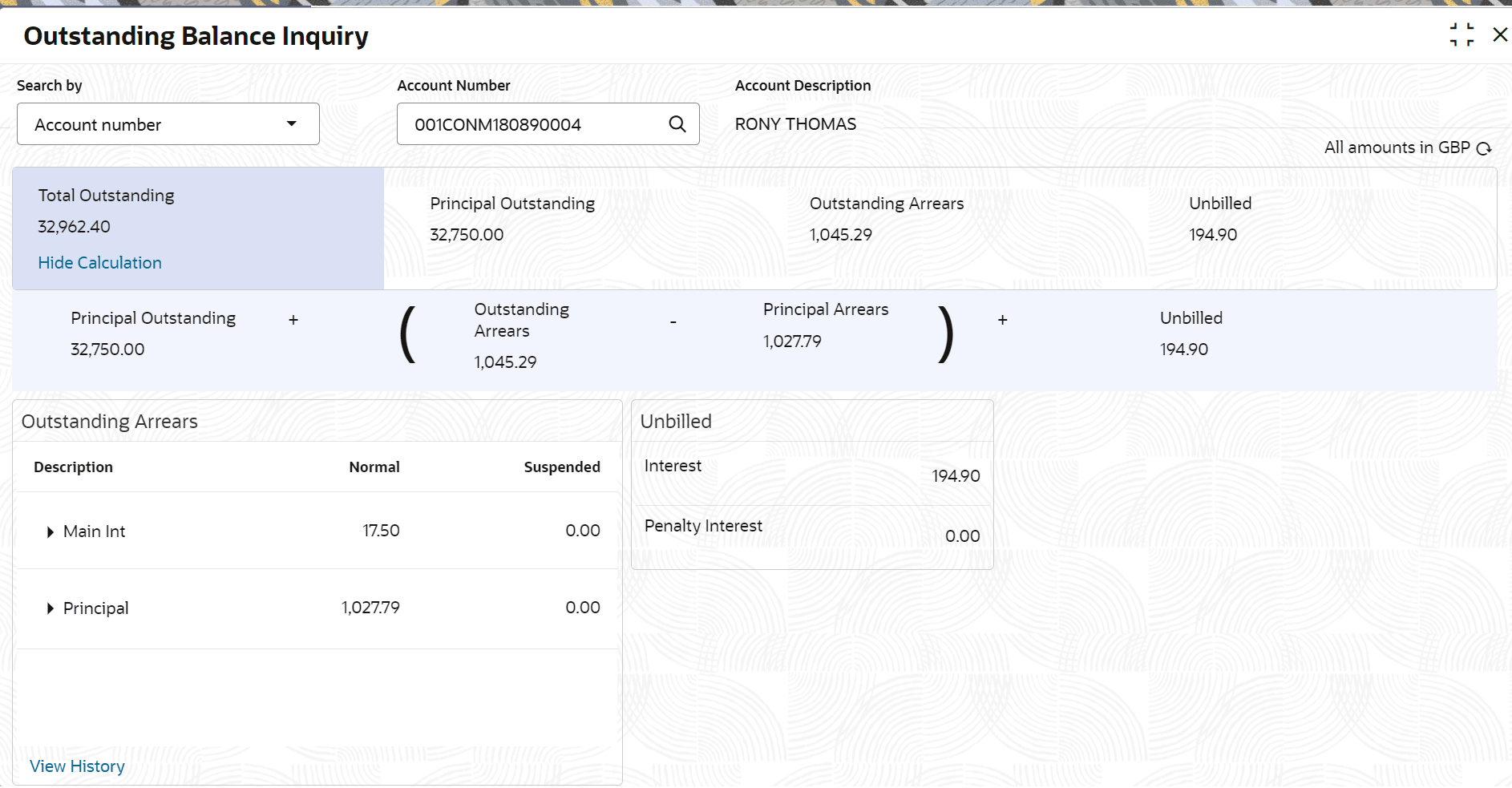 If you click the Show Calculation link, the formula used to calculate the total outstanding amount is displayed. To hide the formula, click Hide Calculation link.Principal Outstanding Displays the principal outstanding arrears as of today’s date. Outstanding Arrears Displays the other arrears outstanding as of today’s date. Note: