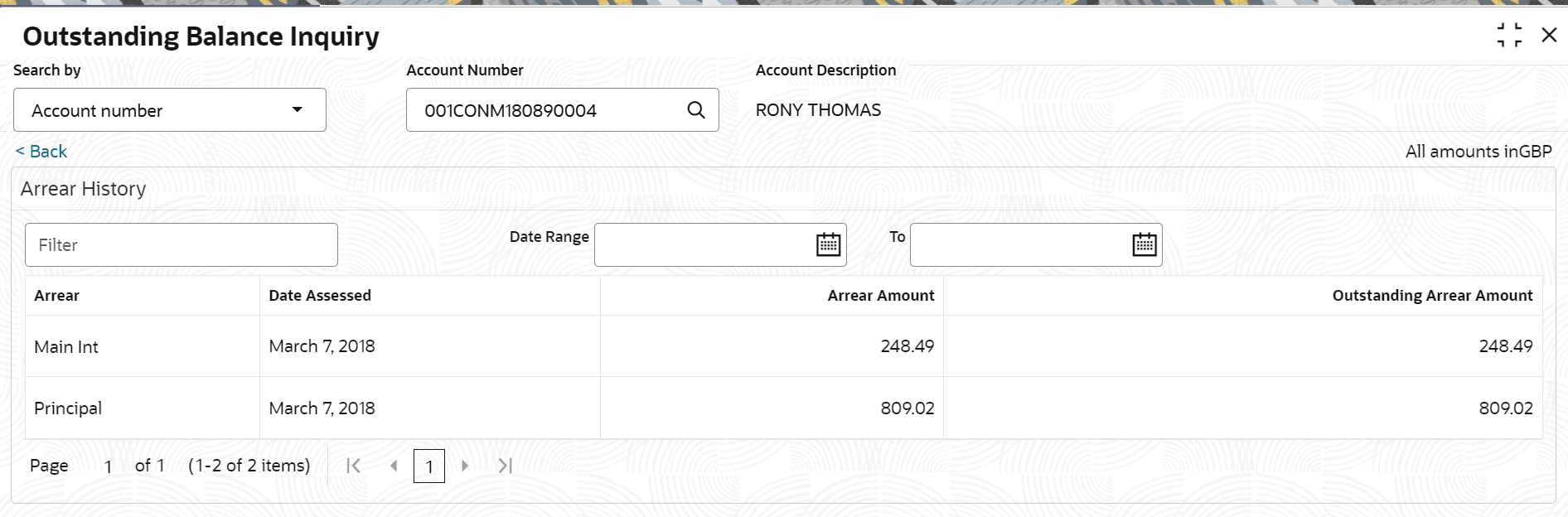 Field Description Filter Specify the details to filter the details displayed. Date Range Specify the start date from which you need to view the arrear. To Specify the end date till which you need to view the arrear. Arrear Displays the description for the arrear displayed. Date Assessed Displays the assessment date of the arrear. Arrear Amount Displays the arrear amount. Outstanding Arrear Amount Displays the outstanding arrear amount. - Click the Back link to navigate to Outstanding Balance Inquiry screen.