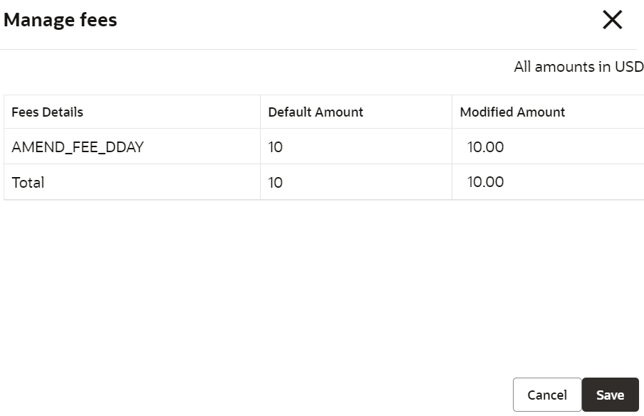Field Description Charge Details Displays the details of the charge applied on the account. Defaulted Amount Displays the defaulted fees amount on the account. Modified Amount Displays the latest fees amount. Note: