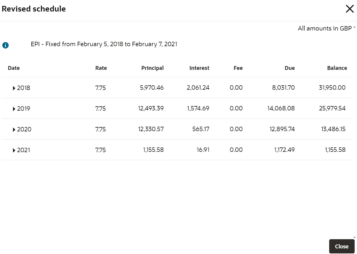 Rate Displays the rate of interest. Principal Displays the amount of principal arrears. Interest Displays the amount of interest. Fee Displays the amount of fees. Due Displays the amount due. Balance Displays the balance amount after every installment. - Click Submit.A confirmation message is displayed, click Confirm to proceed.
