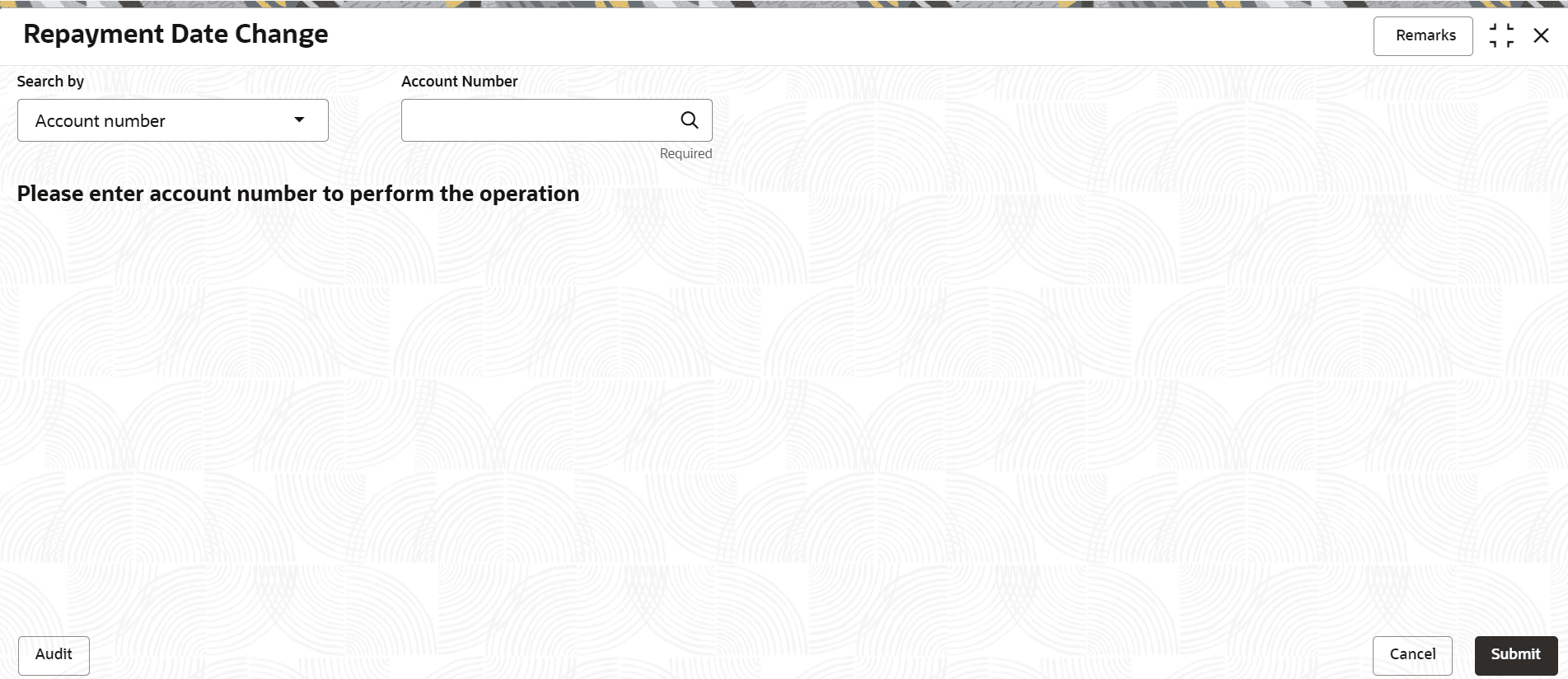 The label of the field adjacent to the Search by field changes dynamically. For example, if the Account number is chosen as the search criteria, the label of the adjacent field is displayed as the Account Number. If SSN is chosen as the search criteria, then the adjacent field would display the label as SSN.New Details This section displays the new repayment date change details. Select Option Select the preferred repayment option. The options are: - Specific day of the month: If you select this option, then select the day from the Select Day field. Also, the next payment date will be displayed with the updated selection.