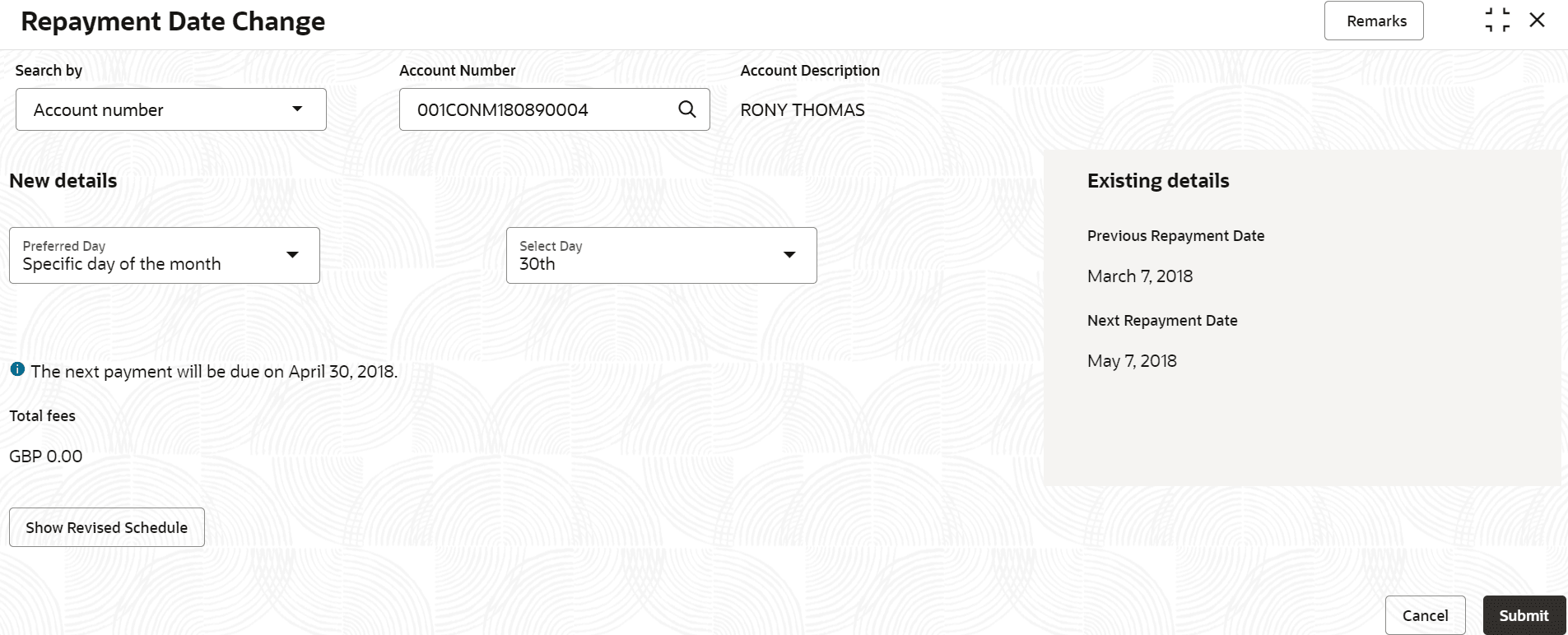 You can change the repayment date for your monthly loan account and see the updated details by using the Repayment Date Change screen.