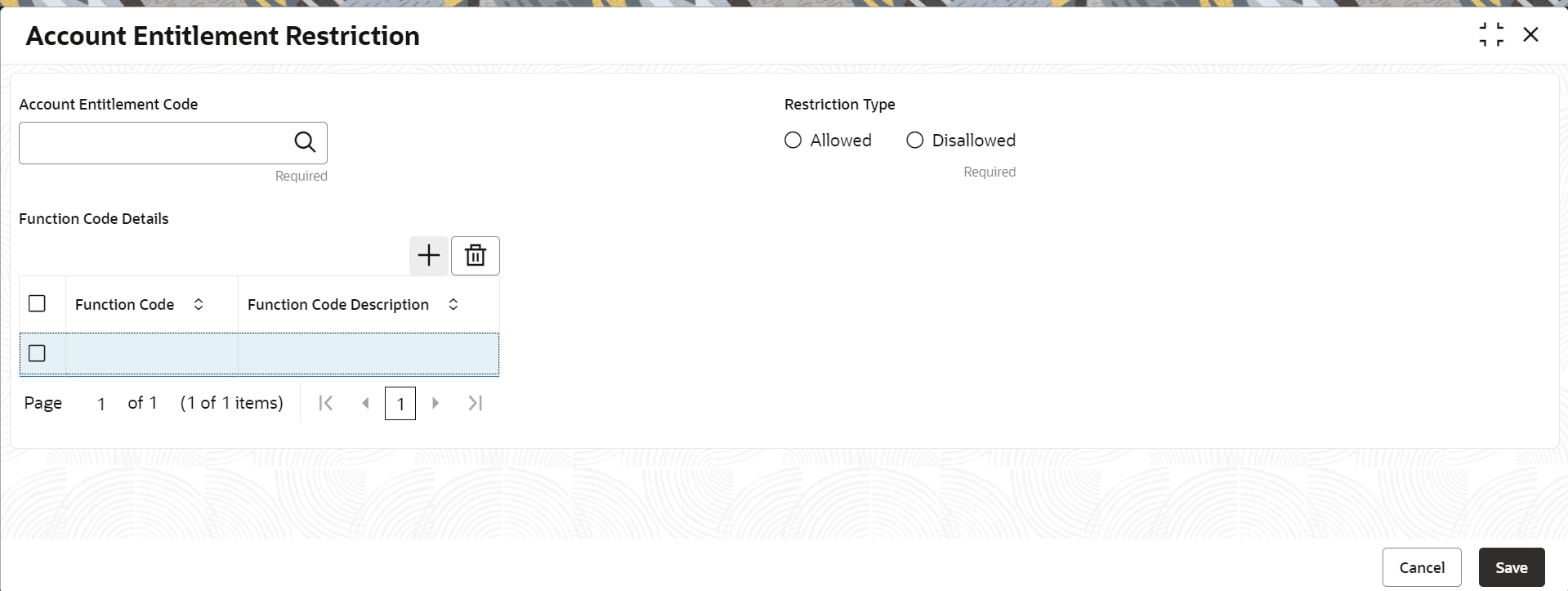 This screen is used to maintain the Account Entitlement Group by grouping the set of Customer accounts. To process this screen, type Account Entitlement Restriction in the Menu Item Search located at the left corner of the application toolbar and select the appropriate screen (or) do the following steps: