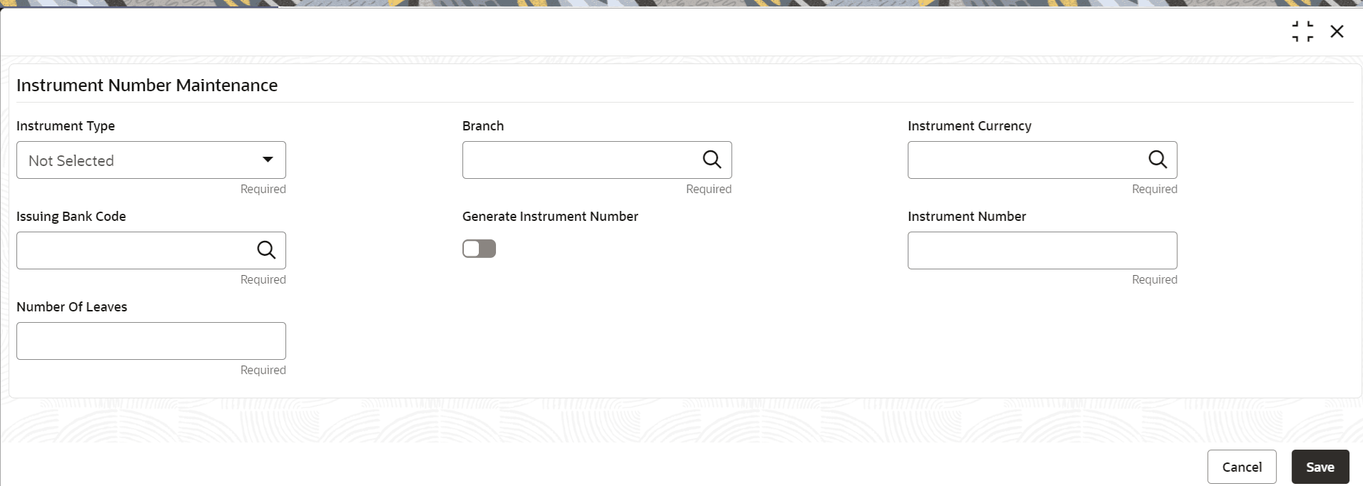 Instrument Currency Click Search icon and select the currency code from the list of values. Issuing Bank Code Click Search icon and select the bank code from the list of values. Generate Instrument Number